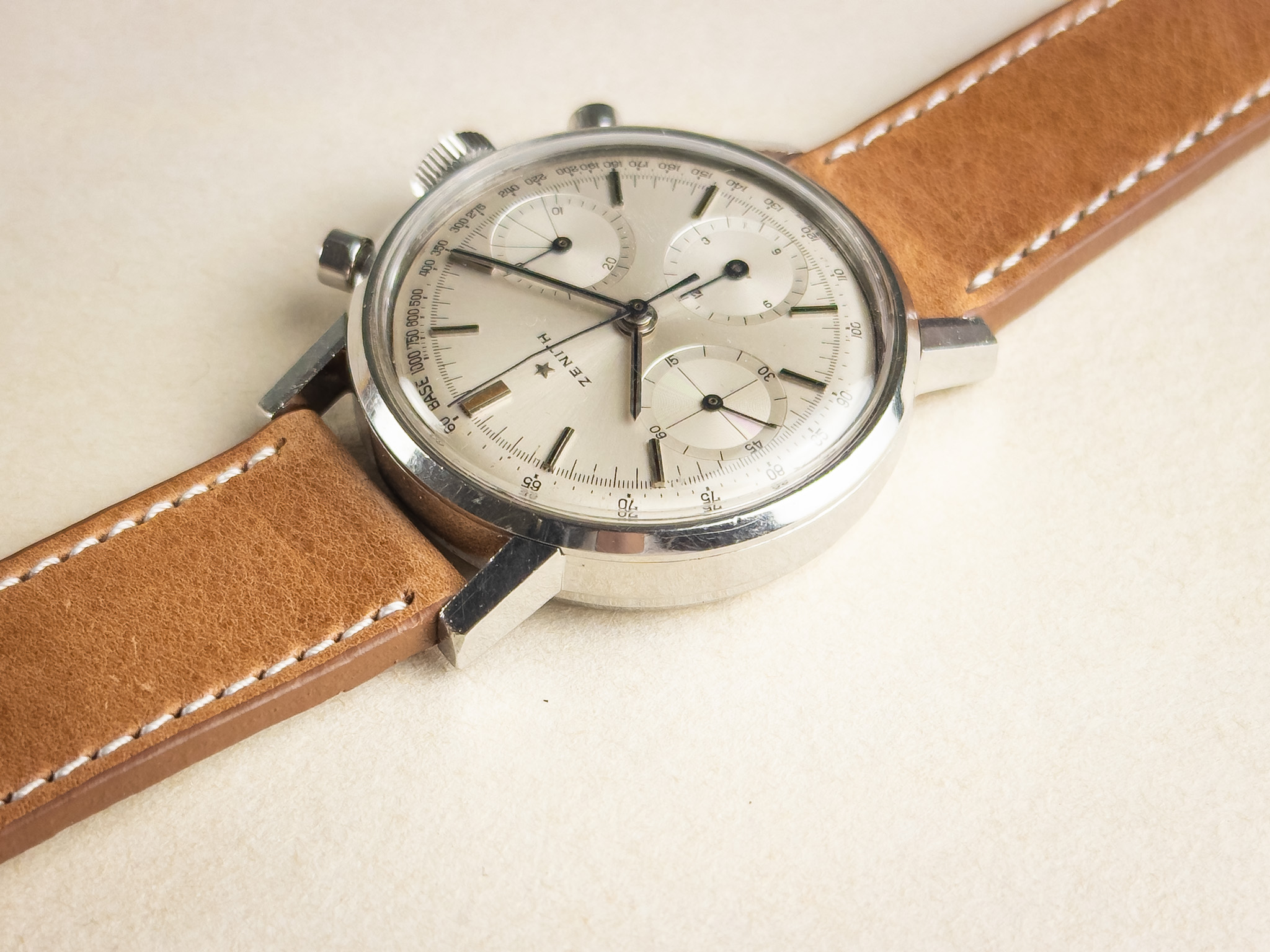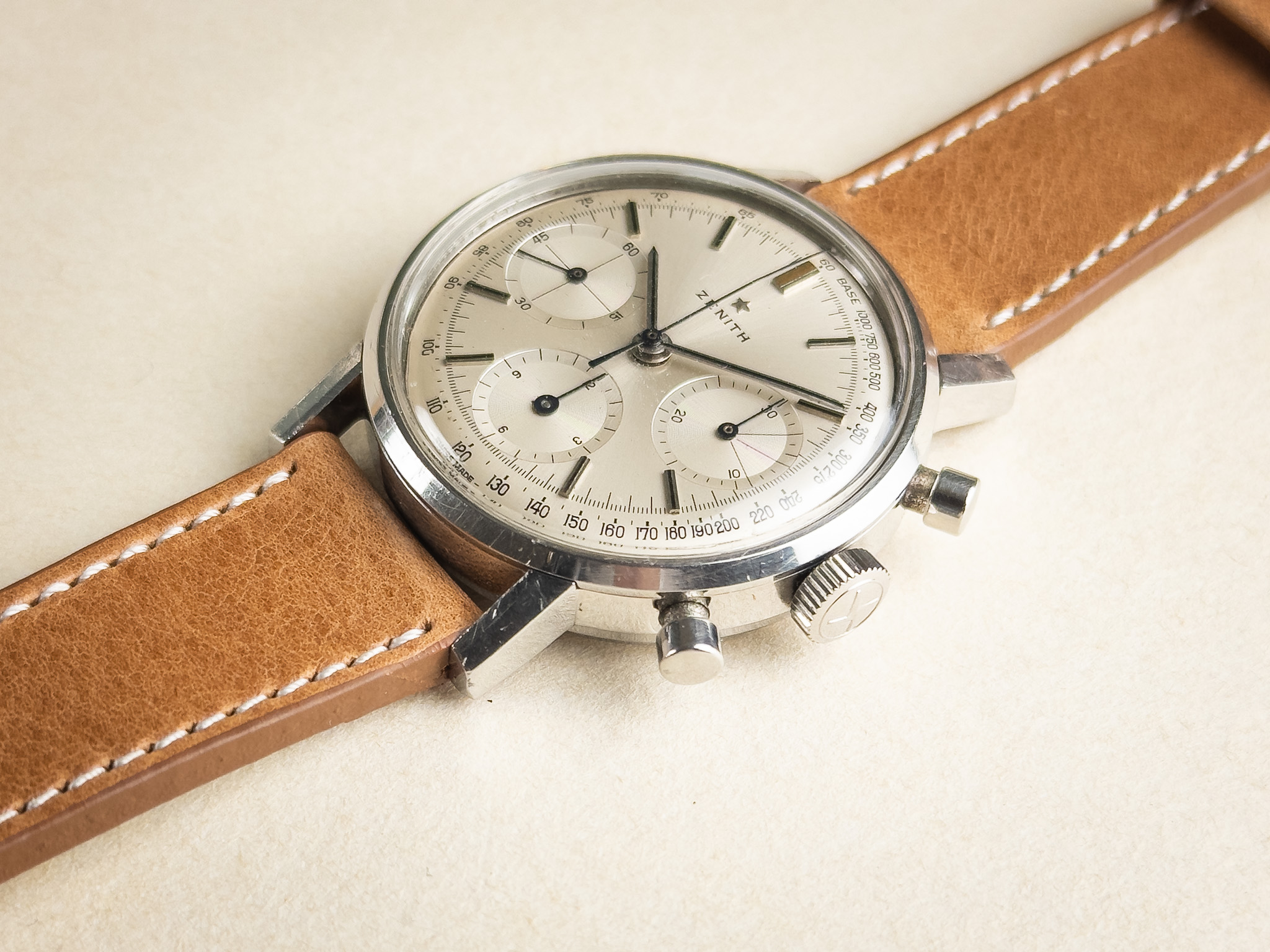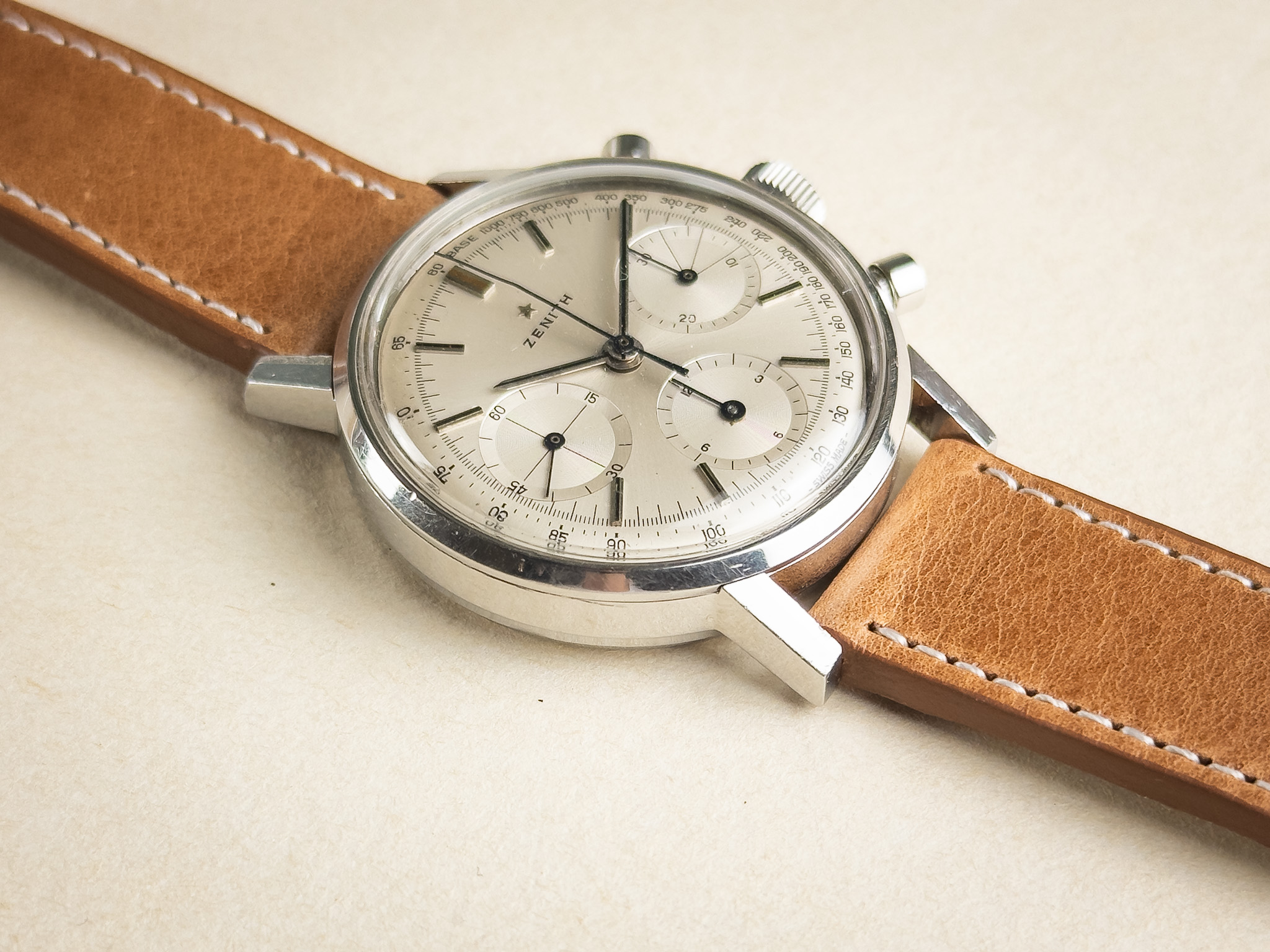 Condition: This 1960s chronograph is presented in very nice overall condition and performs strongly. The movement is running well, and the chronograph functions correctly, with smooth start, stop, and clean reset. The case is in good condition, showing only shallow surface scratches from normal wear and likely remains unpolished, retaining its original lines and proportions. The dial is in excellent condition with almost no visible signs of aging, offering a clean and crisp appearance that is particularly appealing for a watch of this era. Overall, this is a very attractive example of a minimalist 1960s chronograph, combining strong mechanical performance with well-preserved aesthetics.