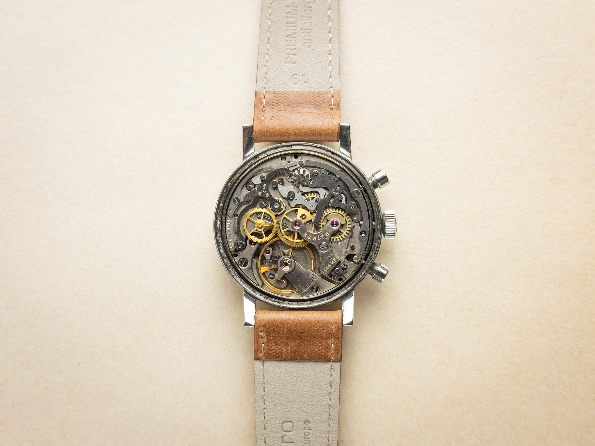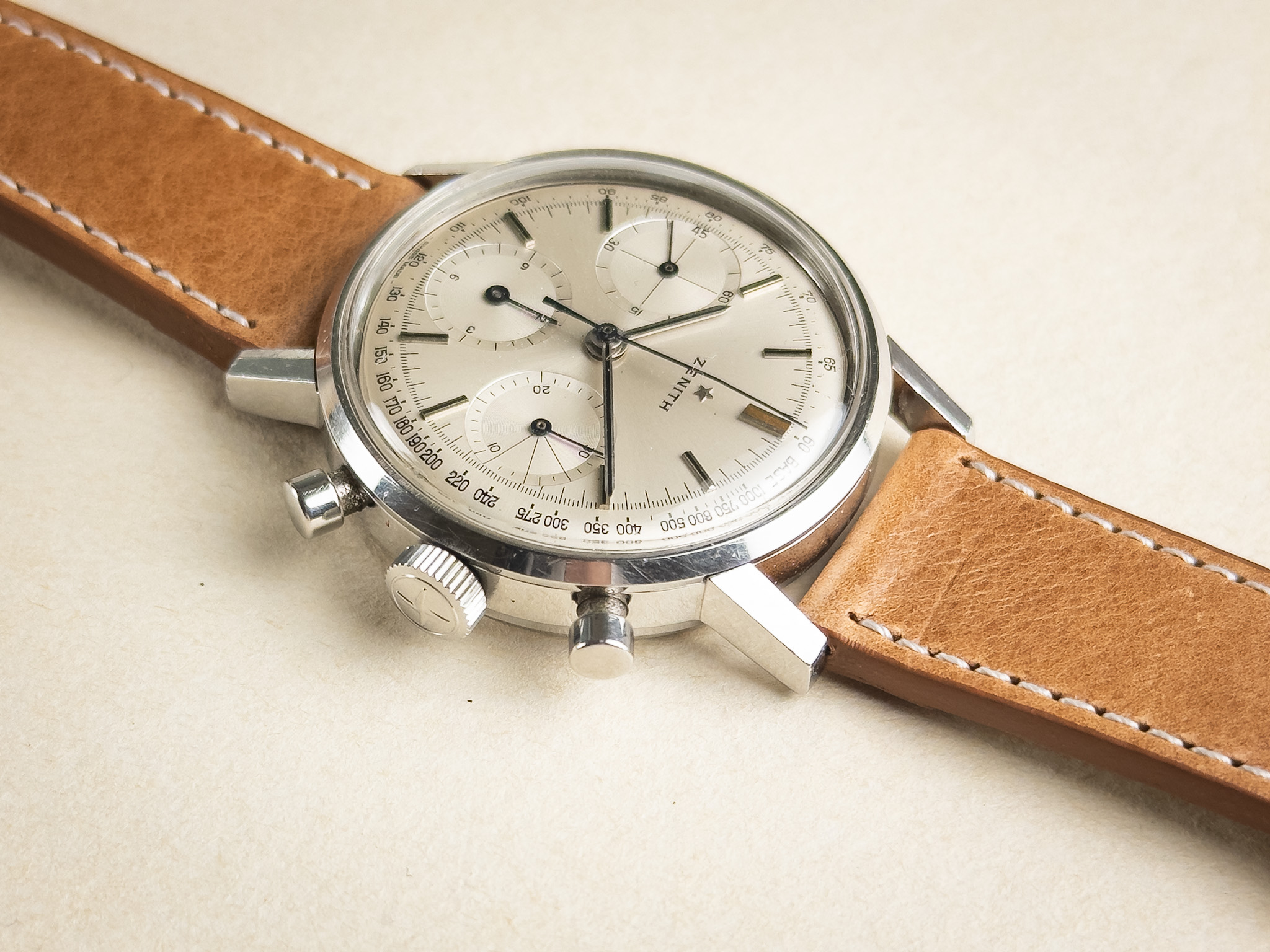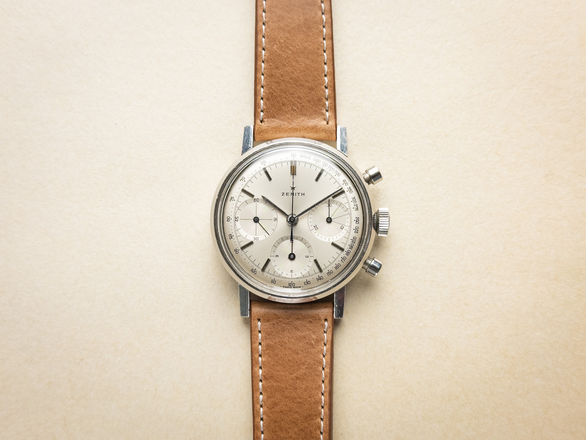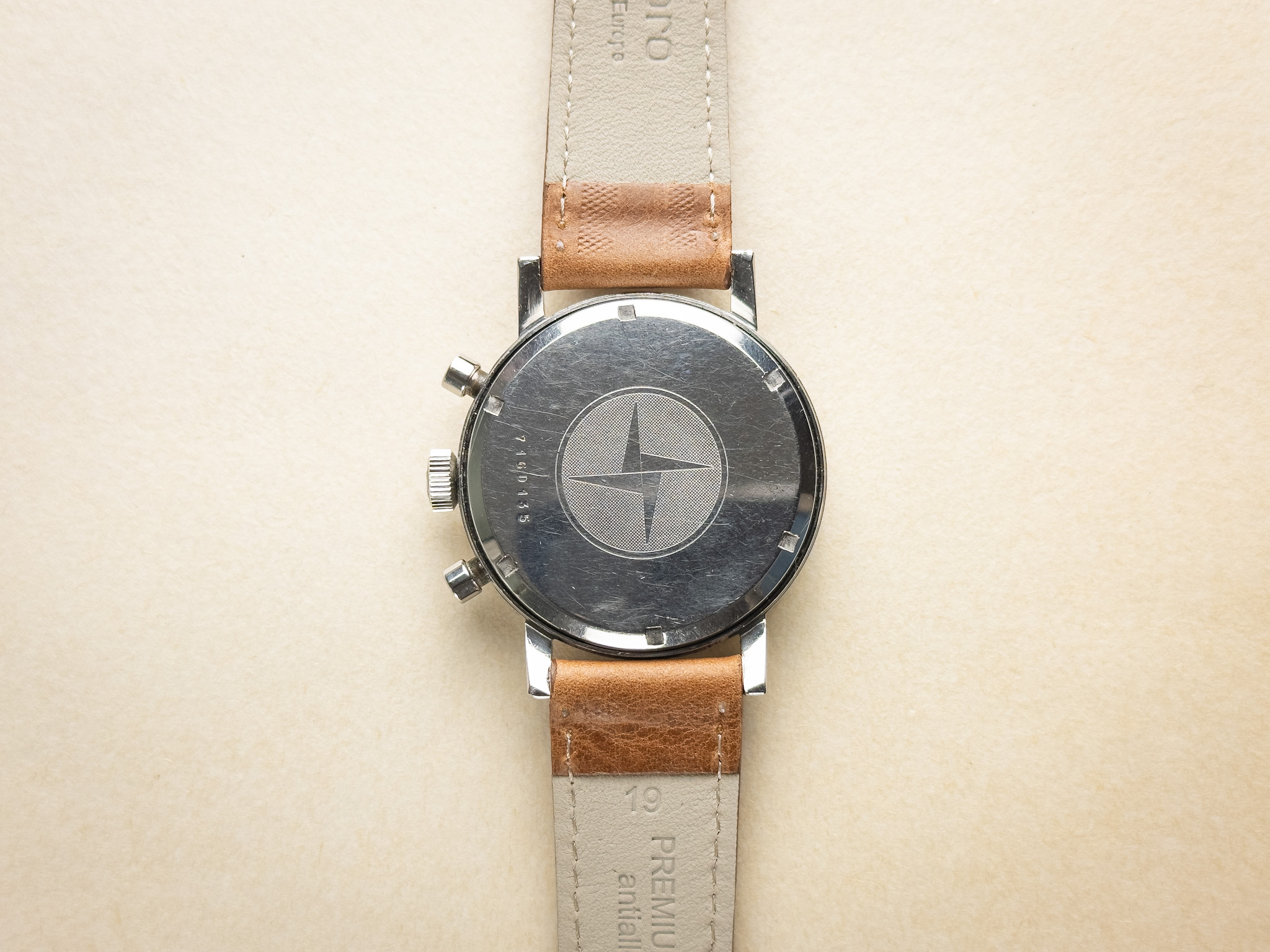 Condition: This 1960s chronograph is presented in very nice overall condition and performs strongly. The movement is running well, and the chronograph functions correctly, with smooth start, stop, and clean reset. The case is in good condition, showing only shallow surface scratches from normal wear and likely remains unpolished, retaining its original lines and proportions. The dial is in excellent condition with almost no visible signs of aging, offering a clean and crisp appearance that is particularly appealing for a watch of this era. Overall, this is a very attractive example of a minimalist 1960s chronograph, combining strong mechanical performance with well-preserved aesthetics.