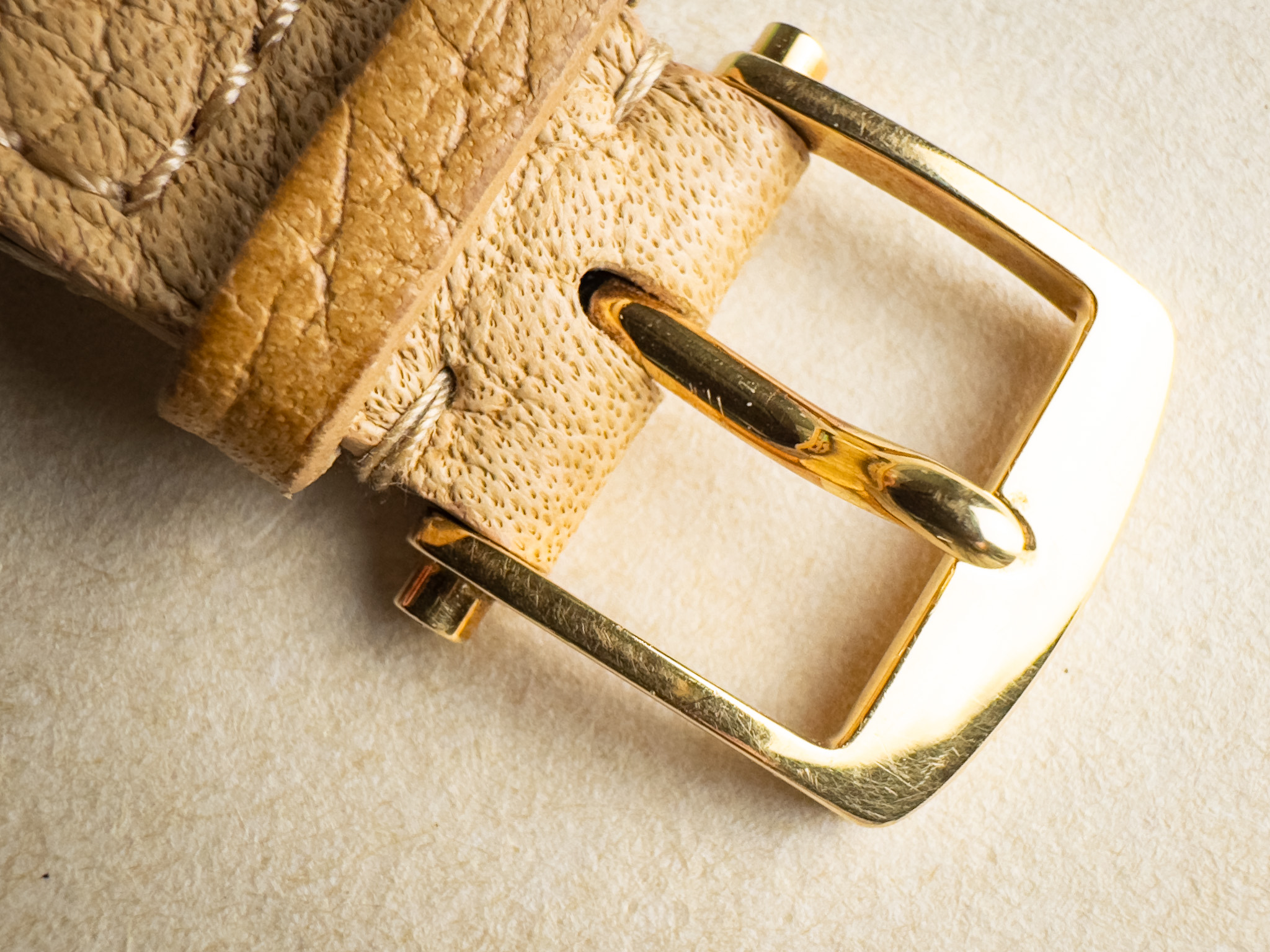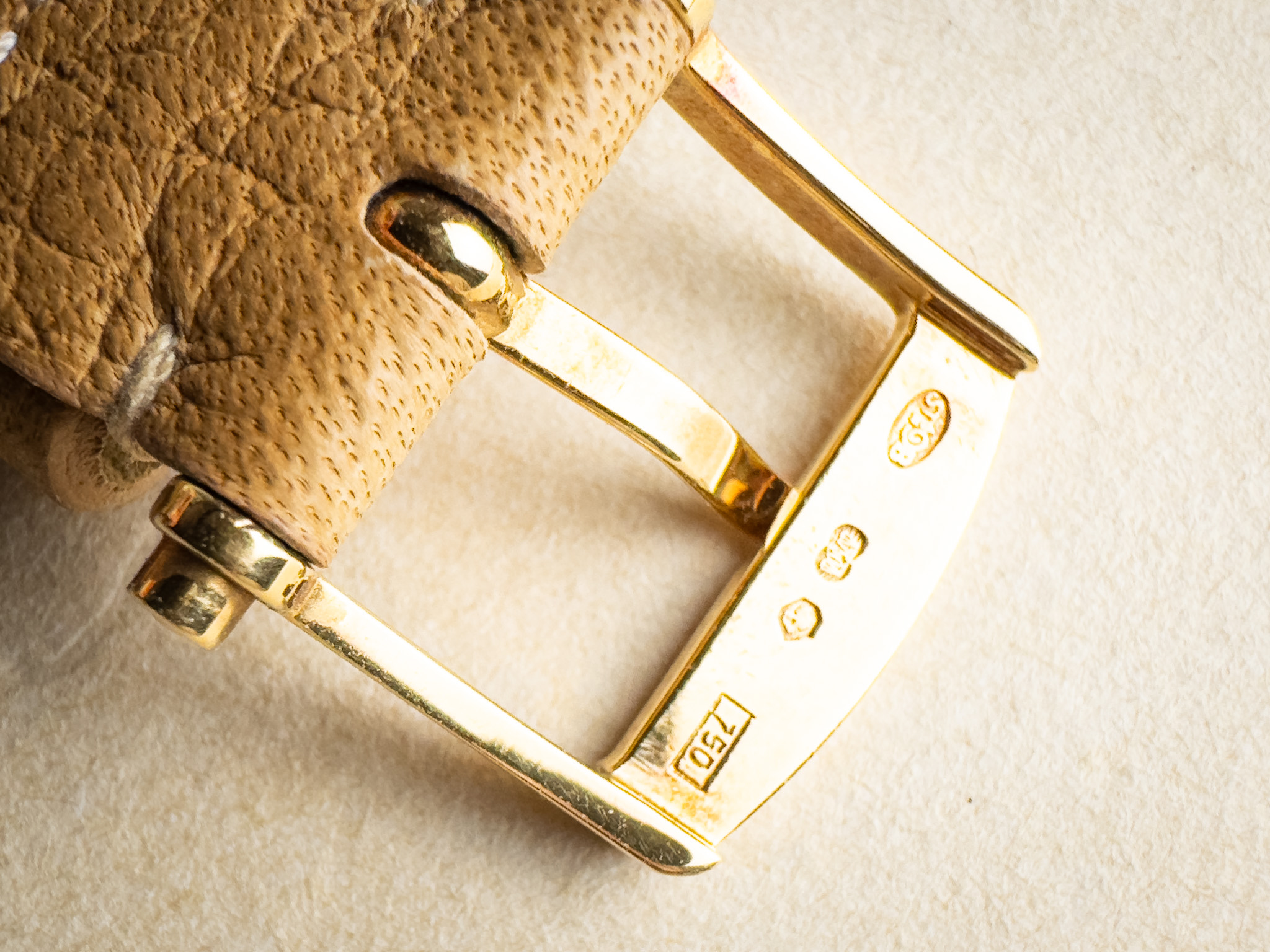 Strap: Light brown Italian leather strap, original 18 K gold pin buckle